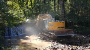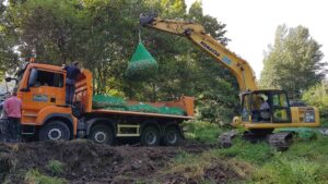 Pour ces travaux, il est utilisé couramment une pelle sur chenille de 28T équipée de tous types de godets (curage, curage orientable, terrassement, pince hydraulique, enfonce pieux etc…).